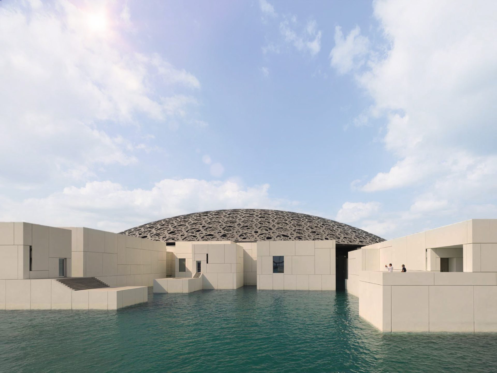 Construit sur l’île de Saadiyat au cœur d’Abu Dhabi, la construction du musée du Louvre s’apparente à un archipel construit sur la mer. Avec une déambulation extérieure rythmée de cours, passages et escaliers. En phase avec son environnement immédiat, elle s’inspire de l’architecture arabe. Avec pour symbolique une impressionnante coupole ouvragée de 180 mètres de diamètre. Elle tient lieu de place centrale tout en agrégeant les 55 bâtiments/blocs qui abritent 26 galeries. Inspiré par le motif des feuilles de palmier, son dôme composé de huit couches perforées de différents formats en acier inoxydable et aluminium superposées, laisse filtrer les rayons lumineux créant un effet « pluie de lumière ».