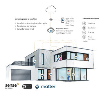 Les capteurs sans fil Sense by MACO fonctionnent selon la nouvelle norme intersectorielle Matter relative aux nouvelles solutions de domotique. Universelle, Matter est synonyme d’indépendance par rapport aux fabricants. Les consommateurs peuvent combiner ainsi de nombreux produits de fabricants différents et avoir de ce fait la liberté de choisir de renforcer leur sécurité, d’optimiser leur consommation énergétique ou encore de contrôler les températures intérieures de leur maison sans obstacle de protocole. Une seule condition : tous les éléments connectés doivent respecter la norme Matter.