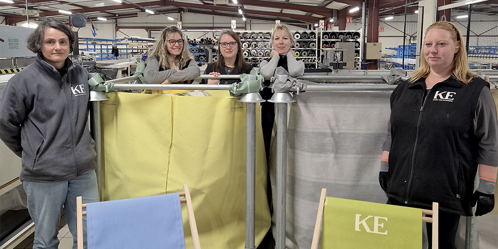 En parallèle, les équipes KE France ont développé une offre de réemploi simple et efficace : une collection de chiliennes confectionnées pendant la basse saison à partir des chutes de production. Une centaine d’exemplaires ont été vendus l’hiver dernier. Les opératrices proposent aujourd’hui d’y ajouter un coussin assorti, en réemployant les chutes de production et en utilisant de la matière effilochée comme garnissage. Une illustration très concrète du potentiel créatif des équipes lorsqu’on leur donne la main sur la valorisation des matières.