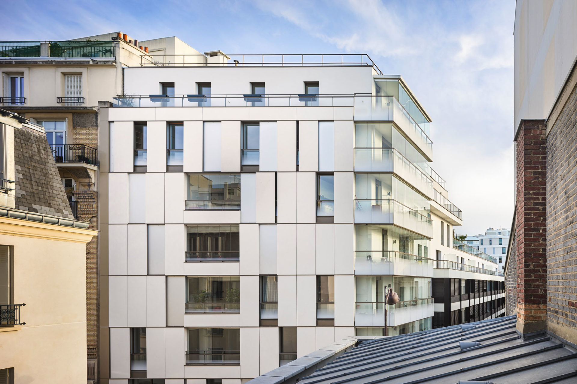 Avec pour ligne directrice la protection des habitants et leur sentiment de bien-être, les espaces de balcons et loggias sont protégés par des éléments coulissants vitrés. Ce sont notamment des panneaux coulissants pivotants fabriqués par l’entreprise allemande Sunflex qui ont été choisis pour ce projet parisien. Pour Andreas Kurtenbach, cette enveloppe de verre est indispensable : « en ville, la proximité peut être dérangeante : personne n’a envie que son voisin entende ce qu’on se dit sur le balcon. De plus, les bruits de la rue peuvent représenter une véritable nuisance sonore. » Or les systèmes de coulissants, une fois fermés, permettent de couper le son.