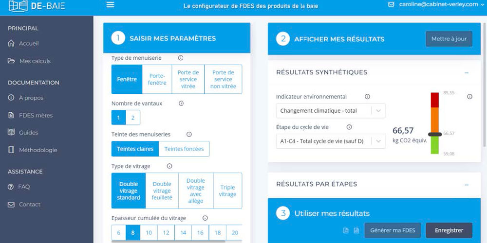 Grâce à une interface intuitive et simple d’utilisation, les professionnels peuvent configurer une FDES en temps réel, en renseignant les paramètres du chantier : type de menuiserie (fenêtre, porte-fenêtre) ; nombre de vantaux ; teinte (claire ou foncée) ; type de vitrage et épaisseur ; distance entre le site de fabrication et le lieu de pose. En quelques secondes, des résultats fiables et synthétiques s’affichent en fonction de l’indicateur environnemental (réchauffement climatique, pollution de l’eau, matériaux destinés au recyclage…) et de l’étape du cycle de vie (approvisionnement en matières premières, transport vers le site de fabrication, utilisation, maintenance…) choisis. L’équivalent carbone du CO2 obtenu est positionné par rapport à la valeur de la FDES collective. Pratique, cette FDES spécifique au chantier peut également être téléchargée au format PDF sur un format et une mise en page similaires à celle collective.