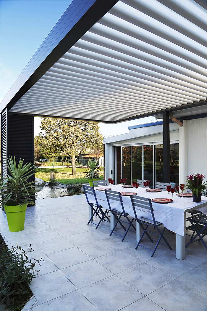 Les configurations et esthétiques de l’Espace de vie MULTI-SAISONS Suneal sont multiples. Les lames motorisées s’intègrent parallèlement ou perpendiculairement au bâti et s’orientent jusqu’à 130°. La structure est pilotable à l’aide d’une télécommande fournie par Technal (et peut être raccordé à un système de gestion centralisée).