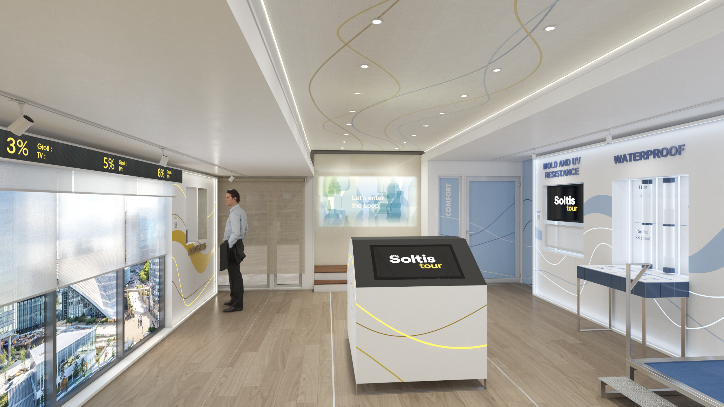 Le camion Soltis offre une expérience organisée en trois univers distincts, chacun mettant en avant les innovations et les performances techniques de la marque.