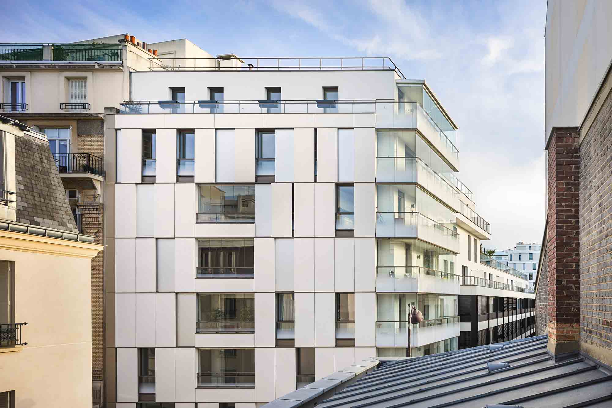 À Paris, la Villa Eugénie, se dresse fièrement au sein du quartier Convention. Le bâtiment, construit selon les normes BBC et qui arbore un design épuré, bénéficie de nombreux avantages. Parmi lesquels la pose de systèmes coulissants pivotants SUNFLEX. Ces derniers veillent à la protection des espaces de vie extérieurs contre la nuisance sonore et les intempéries, pour le confort des résidents.