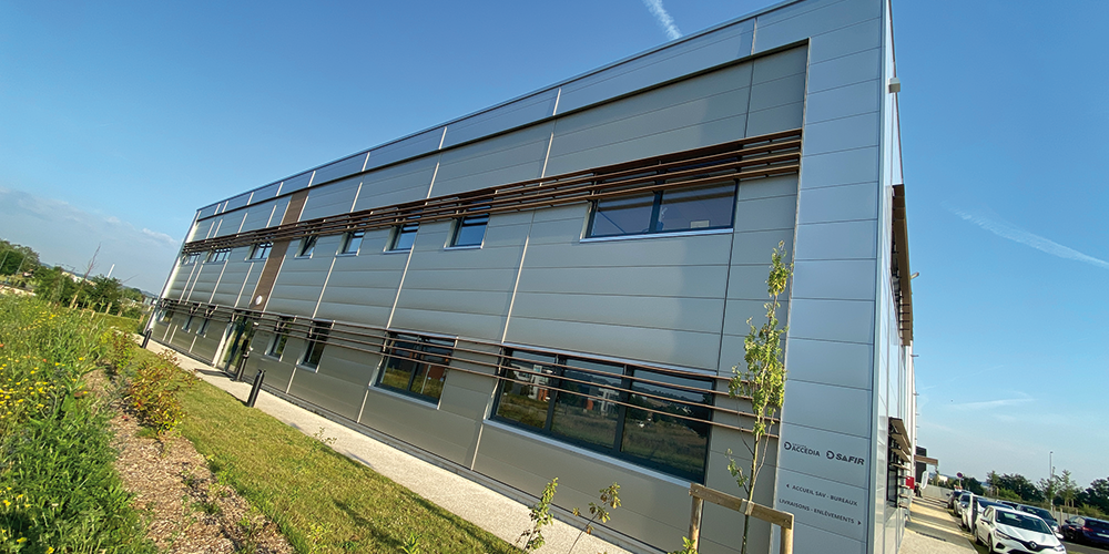 SAFIR, fabricant de portes pour le résidentiel, le collectif, le tertiaire et membre du Groupe Accédia, était à l’étroit dans son usine de Gargenville (78). Le groupe Accédia, après avoir cherché un bâtiment existant, sans rien trouver qui correspondait à ses besoins, s’est donc lancé en 2022 dans la construction d’une usine et de bureaux à Buchelay, la commune qui jouxte Mantes-la-Jolie. Inauguré en juin 2024, le site de Buchelay remplace Gargenville pour la construction des portes collectives et, en même temps, abrite le nouveau siège du groupe Accédia.