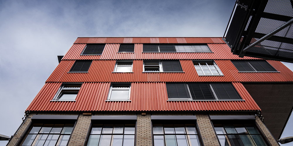 Le bâtiment 118 se compose d’un soubassement existant de 3 niveaux en brique dont les façades, planchers intermédiaires et la structure intérieure ont été conservés au maximum et renforcés lorsque cela s’est avéré nécessaire, afin de tirer profit au maximum de l’existant et de minimiser les déchets du chantier. A cela s’ajoutent trois niveaux de surélévation en structure métallique et façade en bois et isolation paille.
